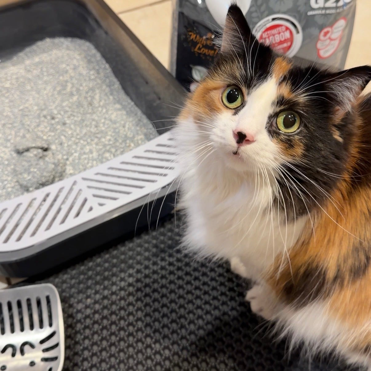 Litter Mat: Reduce mess and waste with our handy anti-tracking mat. The mat's textured surface helps separate granules from paws and traps the discarded litter within its double-layer system. Reuse the trapped litter by simply tipping the mat back over the tray. Say hello to cleaner floors and paws!